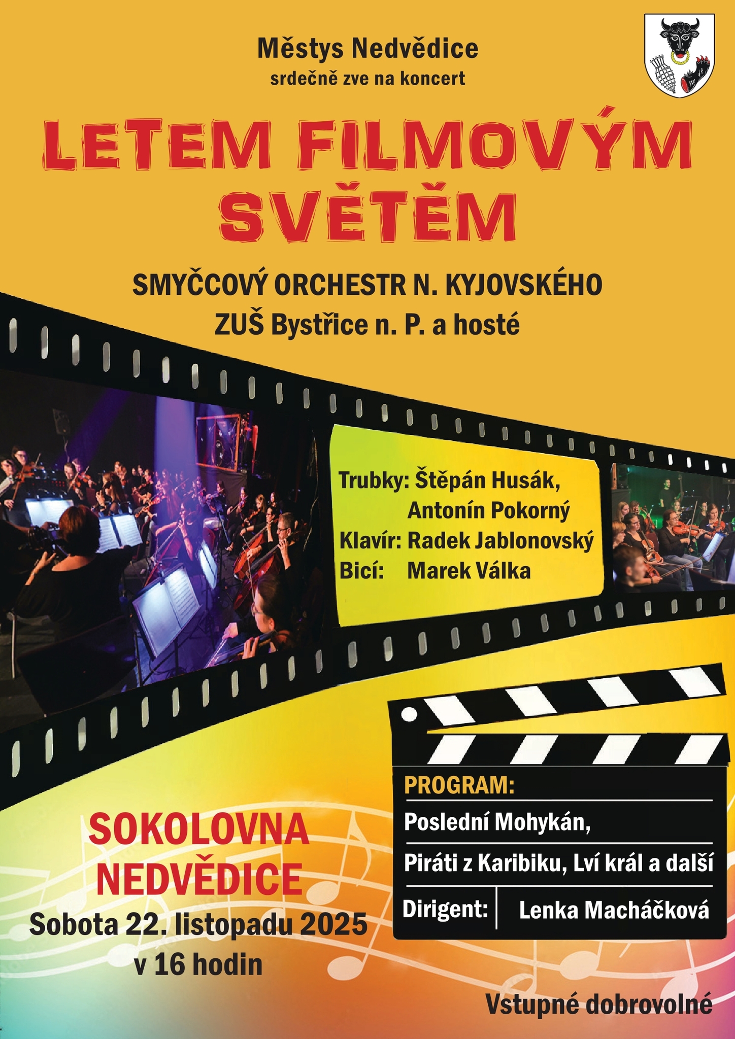 Pokud máte rádi melodie z filmů srdečně Vás zveme na koncert s názvem "Letem filmovým světem" V podání Smyčcového orchestru N. Kyjovského uslyšíte známé melodie a můžete se na chvíli stát třeba Simbou - lvím králem, nebo Posledním Mohykánem, nebo se prostě jen necháte překvapit a unášet tóny krásných skladeb. Skvělou náladu zajistí i naši pozvaní hosté - klavírista Radek Jablonovský, trumpeťáci Štěpán Husák a Antonín Pokorný a na bicí Marek Válka. Těšíme se na Vás v sobotu 22. 11. 2025 v 16.00 v Sokolovně v Nedvědici. Vstupné je dobrovolné.
