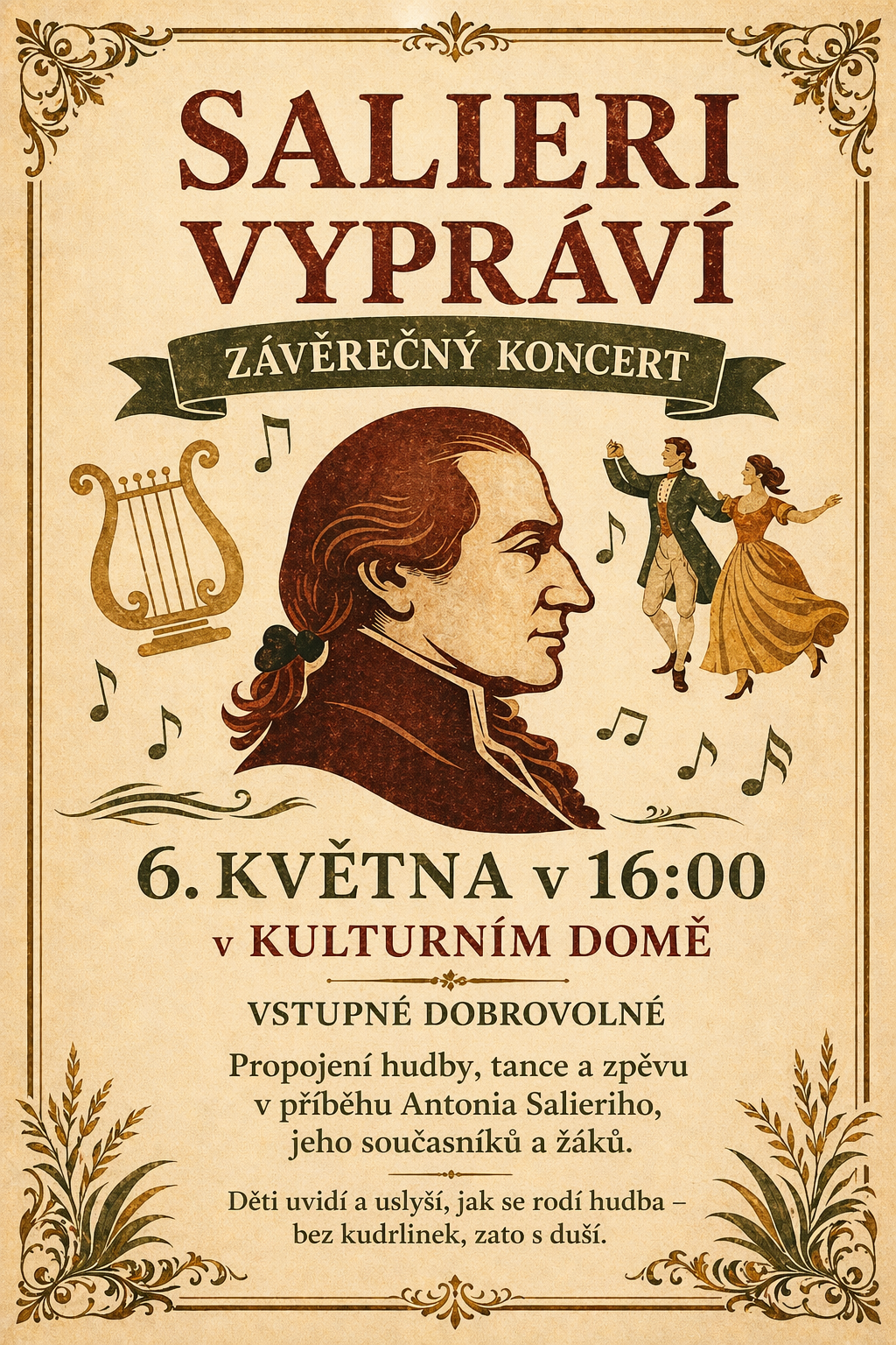 Program Tanečního oboru a hostů propojuje živou hudbu, tanec a zpěv a formou příběhu představuje život a dobu Antonia Salieriho, jeho současníky a žáky. Cílem je ukázat, že hudba není vitrína, ale řemeslo, kázeň a radost z poctivé práce aneb hudba mluví, tělo tančí a dějiny dostanou rytmus. Pojďte se s námi vrátit do dřívějších časů 6. 5. v 16.00. Představení se koná ve velkém sále KD, vstupné je dobrovolné.